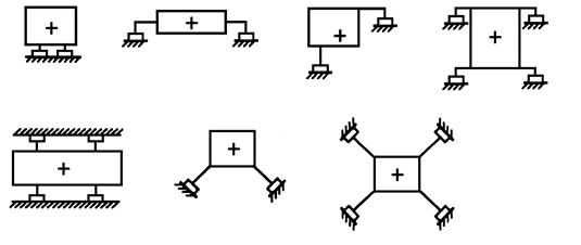 Если между источником вибраций и САУ ЛА установить виброизоляторы (прежнее название – амортизаторы), то можно аналогичные графики построить для определения амплитуды опорных точек N (при условии жесткости корпуса). Из графиков следует, что если выбрать виброизоляторы с собственной частотой много меньше ωВ, то амплитуда колебаний точки N будет меньше АВ. Применяемые схемы установки САУ ЛА на виброизоляторы показаны на рис. 3.4.
