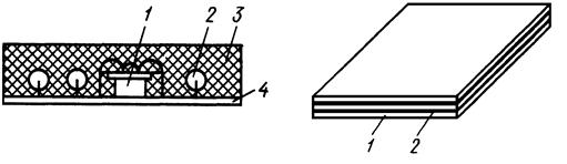 | Рис. 3.5. Заливка вибропоглощающим пенополиуретаном: 1,2 – ЭРЭ; 3 – пенополиуретан; 4 – плата | Рис. 3.6. Демпфирование плат: 1 – конструкционный материал; 2 – вибропоглощающий материал |