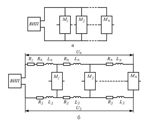 Рис. 3.26. Принципиальная (а) и расчетная (б) схемы подвода «питания» и «земли»: ВИП – вторичный источник питания; R1 –