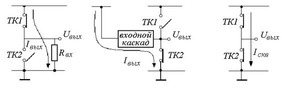 В состоянии статической единицы транзисторный ключ ТК1 открыт, а ТК2 закрыт, обеспечивая на выходе высокое напряжение Uвых. В состоянии статического нуля ТК1 закрыт, а ТК2 находится в режиме насыщения. Наиболее существенными причинами значительных перепадов токов являются сквозные токи, появляющиеся при переключении.