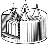 | Рис. 3.34. Примеры герметизации в монолитные оболочки: а - заливка тороидального трансформатора; б – обволакивание микросборки; в - опрессовка | |||