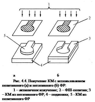 Экспонирование ФР (рис. 4.7) может быть контактным (с прижатием ФШ стороной, содержащей рисунок к слою ФР) и бесконтактным (проекционным или на микрозазоре). Метод контактной печати и печать на микрозазоре позволяют получать элементы КМ из ФР в несколько мкм. Разрешающая способность проекционной печати на порядок выше, но на сравнительно небольшом поле, ограничиваемом характеристиками объективов.
