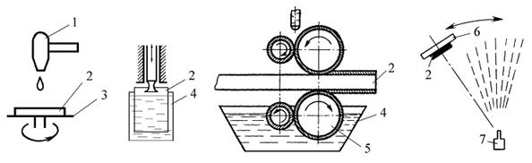 | Рис. 4.6. Методы нанесения жидких ФР: а – центрифугированием; б – окунанием; в – валковый; г – распылением: 1 – дозатор для подачи резиста; 2 – подложка; 3 – столик центрифуги; 4 – емкость с ФР; 5 – валки; 6 - нагреваемая планшайба; 7 - форсунка |