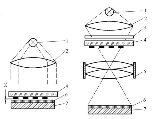 1 – источник актиничного излучения; 2 – конденсор; 3 – фильтр; 4 – ФШ; 5 – объектив; 6 – ФР; 7 – подложка