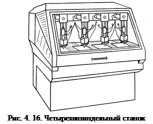 Наибольшее распространение получили четырехшпиндельные станки (рис. 4.16). В лучших моделях станков станина выполнена из черного гранита, коэффициент линейного расширения которого едва поддается измерению. Это означает, что все размеры основных посадочных отверстий сохраняются стабильными. Соотношение большой массы станины с малой массой передвижного рабочего стола (как правило, 40:1) обеспечивает возможность использования больших ускорений и торможений при сохранении стабильности самого станка.