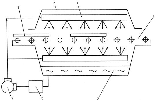 | Рис. 4. 26. Схема установки струйного травления: 1 – заготовка; 2 – корпус; 3 – разбрызгивающее устройство; 4 – конвейер; 5 – травильный раствор; 6 – регенератор отработанного раствора; 7 – система трубопроводов с насосом |