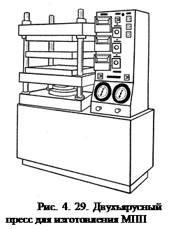 Собранные пресс-формы устанавливают (вручную или с помощью подъемного устройства) между плитами пресса (одна пресс-форма между одной парой плит). Для прессования МПП применяют специализированные многоярусные гидравлические прессы с полу- или полностью автоматической системой управления. Многоярусный принцип позволяет за один цикл одновременно прессовать МШ в нескольких пресс-формах. Плиты пресса оборудованы встроенными системами нагрева и охлаждения. Двухъярусный пресс, открытый для загрузки, показан на рис. 4.29.