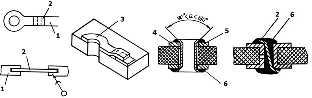 | Рис. 4.31. Ремонт элементов печатного монтажа: а - печатных проводников; б - контактной площадки; в - монтажного металлизированного отверстия; г - переходного металлизированного отверстия; 1 - поврежденный печатный проводник; 2 - перемычка; 3 - новая контактная площадка; 4 - трубчатый переход; 5 - контактная площадка; 6 - припой |