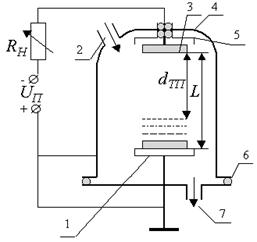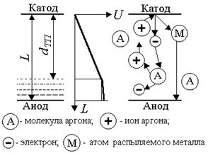 Сначала в вакуумной камере создается низкое давление (10-3…10-4 Па), после чего ее заполняют аргоном при давлении 1…10 Па. При подаче напряжения UП = 1…5 кВ между электродами возникает самостоятельный тлеющий разряд. Разряд разделён на две зоны: тёмное катодное пространство (dТП) и светящаяся область (плазма). На тёмное катодное пространство приходится основное падения напряжения (рис. 4.36, а).