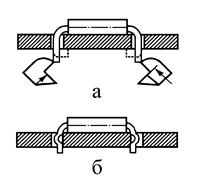 Операция установки компонентов на ПП состоит из следующих переходов: выбор компонента; определение места его установки; перенос или подача компонента к месту установки; ориентация компонента относительно посадочного места; установка компонента. Компоненты со штыревыми выводами фиксируют на ПП путем подгибкой или за счет зиг-формовки (рис. 4.74).