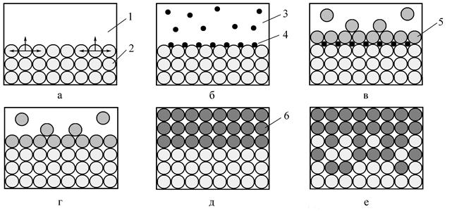 а – металл в вакууме; б – окисление металла воздухом; в – смачивание окисленной поверхности флюсом; г – восстановление и очистка поверхности металла; д – смачивание поверхности металла припоем; е – возникновение зоны сплава за счет диффузии; 1 – вакуум; 2 – металл; 3 – воздух; 4 – оксидный слой; 5 – флюс; 6 – жидкий припой