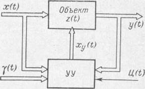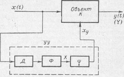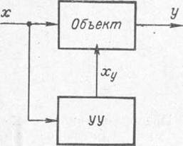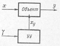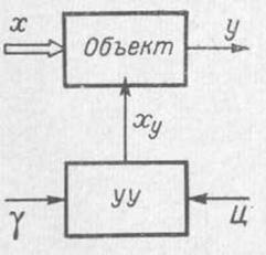 Здесь управляющее устройство УУ воспринимает сигналы у. в зависимости от которых должен изменяться выход у управляемого объекта, и перерабатывает эти сигналы в необходимое управляющее воздействие Ху. Легко обнаружить, что эта схема также является частным случаем обобщенной схемы.