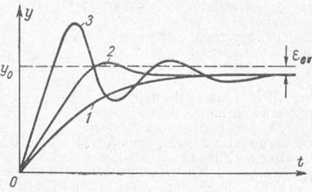 Рис. Типичные формы отклика автоматических систем на скачкообразное возмущающее воздействие: 1 — апериодическая, 2 —с одним выбросом, 3 — колебательная.
