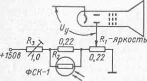 Ручная регулировка яркости производится с помощью потенциометра R1 на который поступает постоянное напряжение от источника +150 в. Параллельно сопротивлению R2 подключен фоторезистор ФСК-1, установленный на передней панели монитора или телевизора. Чем выше освещенность в комнате, тем меньше сопротивление фоторезистора и тем выше потенциал, подаваемый с движка потенциометра R\ па управляющий электрод кинескопа.