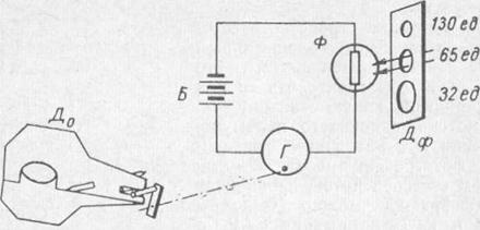 Через этот фоторезистор замыкается цепь питания рамки гальванометра Г от батарейки Б. С вращающейся осью рамки гальванометра связан механизм привода двухлепестковой диафрагмы До, ограничивающей световой поток, который проходит через объектив камеры. С увеличением освещенности уменьшается сопротивление фоторезистора, увеличивается ток через рамку гальванометра, рамка отклоняется на больший угол, что приводит к большему смыканию серповидных лепестков диафрагмы.