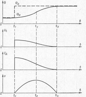 На рис. 38 изображены графики изменения выхода 0И, сигнала ошибки Ue, пропорционального разности ®3— ©и, напряжения на обмотке двигателя £/д и скорости его вращения v после скачкообразного изменения задающего воздействия 03. В первый момент t\, когда появляется ошибка Uа вместе с ней и напряжение на обмотке двигателя С/д, скорость его вращения равна нулю, так как в силу инерции двигатель не сразу трогается с места и лишь со временем набирает скорость, соответствующую подведенному к нему напряжению. В период разгона (t\ —t2 на рис. 38) первоначальное рассогласование сначала уменьшается медленно, а затем все быстрее. Однако с уменьшением рассогласования начинают падать и напряжения Ui И [/д. В результате этого, набрав в некоторый момент t2 наибольшую скорость вращения, при которой ошибка 1/Е уменьшается наиболее быстро, двигатель снова начинает замедлять свое вращение и при подходе системы к балансу (@и = @з, Us =0) останавливается в момент U.
