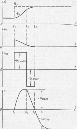 При появлении ошибки в момент 11 надо сразу же подать максимально возможное напряжение + Уд. макс на двигатель и держать его в течение некоторого времени неизменным, невзирая на уменьшение ошибки Uе. В этом случае двигатель быстрее всего наберет максимальную скорость + уМакс- Для того чтобы не проскочить по инерции заданное положение, надо заблаговременно, в определенный момент времени t2, снять напряжение Н-ІУд. макс и для быстрейшего торможения подать на двигатель напряжение противоположной фазы,— {/д. маис, стремящееся сменить направление вращения двигателя. Момент времени t2 должен быть выбран так, чтобы скорость вращения двигателя обратилась в нуль точно в тот момент, когда выходная переменная 0И будет равняться заданному значению (когда ошибка Ut обратится в нуль). В этот же момент t3 надо снять напряжение с двигателя.