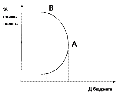Точка А на кривой показывает предела налогового изъятия у хозяйствующего субъекта, превышение которого ведет к спаду налоговых поступлений. В точке В хозяйствующий субъект может быть либо разорен, либо близок к этому, поскольку остающиеся в его распоряжении средства после уплаты налога являются недостаточными для осуществления расширенного воспроизводства.