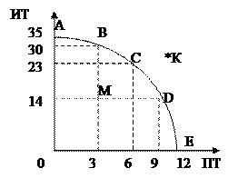 Проблема выбора иллюстрируется с помощью модели кривой производственных возможностей (КПВ). Модель строится при определенных предпосылках: 1) производится два товара или две разновидности товаров (например, инвестиционные и потребительские; X и Y); 2) экономика функционирует в условиях полной занятости и полного использования всех ресурсов; 3) количество ресурсов, используемых для производства фиксировано; 4) технологии неизменны. Модель показывает, таким образом, комбинации рассматриваемых благ могут быть произведены при полном и эффективном использовании ресурсов или это кривая каждая точка которой показывает максимальный объем производства двух товаров при данных ресурсах. Любая точка на кривой показывает, сколько товаров X и Y можно произвести, если направить на их производство все имеющиеся ресурсы. Например, в точке В производится 30 ед. инвестиционных товаров и 3 ед. потребительских, в точке С – 23 инвестиционных и 3 потребительских. Точки А и Е показывают что производится только один вид благ, т.е. можно, например, произвести максимум 35 ед. инвестиционных товаров, если направить в эту сферу все имеющиеся ресурсы. Точка М отражает неэффективный вариант производства, как и любая точка внутри кривой, так как ресурсы используются не полностью или неэффективно. Точка К считается невозможным вариантом производства, так как ресурсов для ее производства недостаточно.