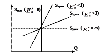 =0) предложения. Графически это выражается в наклоне кривой предложения. Кривые предложения с разной эластичностью служат для описания процессов производства в разные промежутки времени. Так, предложение мгновенного периода считается абсолютно неэластичным, краткосрочного периода – относительно эластичным и долгосрочного периода – абсолютно эластичным (рис.12).