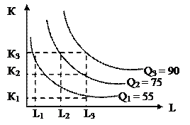 Графически такую функцию можно представит в виде изокванты – кривой равного объема выпуска при разных сочетаниях труда и капитала (любая кривая на рис.18). Изокванты на рисунке соответствуют определенному объему выпуска. Например, на изокванте Q1 отмечены все сочетания производственных факторов, сочетание которых дает 55 единиц продукции, на Q2 – 75 единиц продукции, на Q3 – 90 единиц. Совокупность изоквант на плоскости (рис. 18), каждая из которых показывает максимальный объем выпуска продукции, достигаемый при использовании определенного сочетания факторов производства называется картой изокван т. При этом, Q3>Q2>Q1.