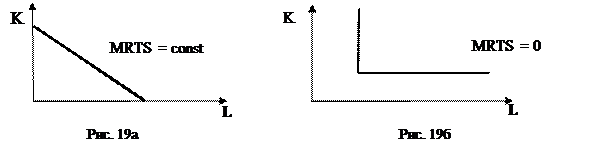 Линейная изокванта (рис. 19а) предполагает совершенную взаимозаменяемость факторов На рис. 19б, изображена изокванта, которая иллюстрирует жесткую взаимодополняемость факторов и единственно возможный вариант производства. Изокванта может иметь вид ломаной кривой. Это означает возможность сочетания факторов производства для нескольких вариантов. Традиционно для анализа используют изокванту, предполагающую возможность непрерывной заменяемости ресурсов. При этом предполагается, что продукция и применяемые ресурсы бесконечно делимы, а предельная норма технологического замещения убывает (см. рис. 18).