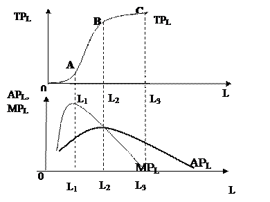 Количество используемого фирмой ресурса, таким образом, будет находиться в интервале L2-L3, а объем выпуска в интервале отрезка В-С. Объемы применения переменного ресурса, при которых достигается максимум среднего продукта (АР) и нулевой предельный продукт (МР) называют соответственно экстенсивным и интенсивным пределами использования фиксированного количества постоянного ресурса. Диапазон занятости переменного ресурса между экстенсивным и интенсивным пределами использования переменного ресурса называется эффективной зоной.