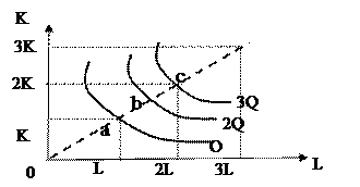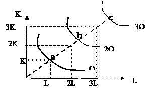 Посредством карты изоквант можно наглядно представить отдачу от масштаба. При постоянной отдаче от масштаба изокванты Q, 2 Q, 3 Q,..., nQ делят луч, исходящий из начала координат и называемый линией роста, на одинаковые отрезки (рис. 22а).
