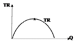 Динамика выручки может быть проиллюстрирована в координатах «цена- выручка» (рис. 1). Если отложить на оси абсцисс количество реализуемой продукции (Q), а по оси ординат – совокупный доход (TR), то при условии, что цена не изменяется, получим луч, выходящий из начала координат. Тангенс угла наклона (α) будет отражать цену продукта (P). Чем выше цена, тем круче угол наклона. Если цена товара изменяется, и снижается по мере увеличения объема продаж, то функция выручки будет иметь другой вид. А именно, до тех пор, пока продажи осуществляются при эластичном спросе, выручка будет расти при увеличении объема продаж и достигнет максимума в точке единичной эластичности. Как только спрос станет неэластичным, выручка будет сокращаться по мере увеличения продаж. А графически это будет выглядеть следующим образом (рис. 23):
