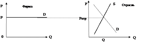 Фирма в условиях совершенной конкуренции принимает рыночные цены как данные, являясь ценополучателем, поскольку объем ее производства является незначительным, и она не может оказать существенного влияния на рыночную цену. Это означает, что цена равна среднему доходу и предельному доходу (P=AR=MR). Кривая спроса на продукцию фирмы, работающей в условиях совершенной конкуренции, является абсолютно эластичной (см.рис. 30), а кривая спроса на продукцию всей отрасли имеет отрицательный наклон, так как покупатели приобретают больше при низкой цене и меньше – при высокой. Условием равновесия фирмы на рынке или условием максимизации прибыли или выбора оптимального объема является условие P=MC, так как в условиях чистой конкуренции предельный доход всегда равен цене MR = P.