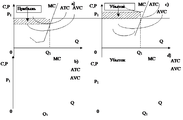 Фирма конкурент определяет оптимальный объем производства в зависимости от уровня цены и издержек. На рис. 31 изображены MC, AVC, ATC, а также цена Р1, которая установилась на рынке. На рис. 31а показана ситуация максимизации прибыли. Оптимальный объем Q1 установлен на уровне P=MC, цена на рынке установилась выше средних общих издержек (P>ATCmin). Фирма работает с прибылью (заштрихованный прямоугольник). На рис. 31b – цена установилась на уровне ATCmin, фирма работает без прибыли, но и без убытков, с нормальной прибылью. Ситуация считается безубыточной, а общие издержки (ТС) равны общему доходу (TR). Экономическая прибыль равна нулю.