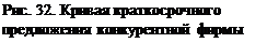 Таким образом, конкурентная фирма не рассматривает производство продукции, если цена равна или меньше AVCmin. Когда фирма производит продукцию, она максимизирует прибыль (или минимизирует убытки), выбирая такой объем производства, при котором цена равна предельным издержкам. При этом кривая предложения фирмы совпадает с кривой MC, лежащей выше точки AVCmin. (рис. 32)