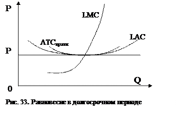 Если фирмы какое-то время убытки (не покрывают своих суммарных издержек), то часть из них предпочтет более выгодное применение ресурсов и покинет отрасль, а другие перестанут заменять изношенное оборудование. В результате предложение товара снизится, а цена возрастет. Процесс выхода фирм из отрасли будет продолжаться до тех пор, пока в данном краткосрочном периоде цена не сравняется с ATC минимальными. Если же все фирмы получают прибыль, то они начнут расширять производство для ее максимизации. Кроме того, в отрасль могут войти новые фирмы, привлеченные высокими прибылями. В результате предложение начнет увеличиваться, а рыночная цена снижаться. Этот процесс будет происходить до тех пор, пока цена не опустится до минимальных средних издержек. Такие ситуации наблюдаются в долгосрочном периоде. Условием равновесия в долгосрочном периоде будет равенство цены, предельных издержек и минимальных средних общих издержек в краткосрочном и долгосрочном периодах: P=LMC= =LAC min=ATC min= MC, (рис. 33).