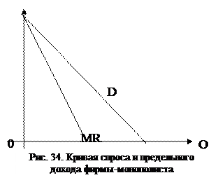 Кривая спроса монополиста (см рис.34) совпадает с кривой отраслевого спроса и имеет отрицательный наклон. Кривая предельного дохода располагается ниже кривой спроса и делит ее проекцию на ось Х пополам. Т.о., для монопольного рынка MR < P при любом объеме выпуска