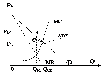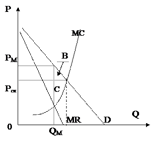 Оптимальный для монополиста выпуск продукции в точке QМ т.к. здесь MR=MC. Чтобы определить цену, надо продолжить перпендикуляр из QМ до пересечения с кривой D. Цена, при которой монополист будет максимизировать совокупную прибыль, установится в точке РМ. Величина прибыли на единицу товара – отрезок ВС, а совокупная монопольная прибыль - прямоугольник РскРмВС. На конкурентном рынке равновесие достигается при Рск (Р=МС).На графике это точка пересечения спроса и МС (точка Рск;Qск)