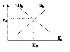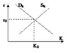 Представленный на рис.47 график позволяет понять экономическую категорию процента как своеобразную равновесную цену на рынке капитала. Спрос на капитал (Dk) предъявляют фирмы, которые накапливают его и инвестируют. Этот спрос увеличивается, если цена заемных средств (r) снижается и уменьшается, если ставка ссудного процента растет (объясняется такая динамика законом убывающей производительности факторов производства). Рассматривая спрос на капитал, имеют в виду спрос на инвестиционные ресурсы.