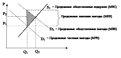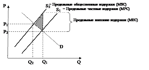 Кривая предложения S1 отражает лишь индивидуальные издержки, которые финансирует фирма-производитель. Издержки же отражаемые кривой S2 включают как индивидуальные издержки, так и внешние. Следовательно, индивидуальные издержки меньше общественных затрат. Производители принимают решение об объеме производства на основе заниженных затрат. Соответственно, равновесная величина продукта Q1 больше оптимальной величины Q2.
