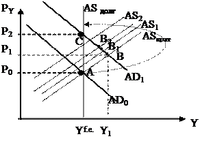 Этот процесс связан с большой безработицей и снижением доходов населения. В долгосрочной перспективе без вмешательства государства может привести к спаду в экономике. Поэтому государство может увеличить совокупные расходы (AD1), выпустив дополнительное количество денег или увеличив госрасходы. В результате экономика останется на уровне полной занятости, но при более высоком уровне цен (т.Е2).