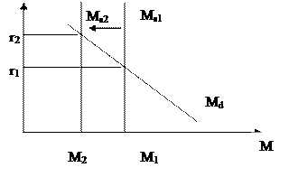 Изменение предложения денег будет активно осуществляться под воздействием изменения направления инструментов денежно-кредитной политики. Сокращение денежной массы отразится на графике смещением линии Ms влево, что приведет к росту рыночной ставки процента.