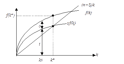 Устойчивое состояние в модели Солоу можно изобразить графически. Производственная функция f(k) вогнута и выходит из нуля. Кроме того, наклон f(k) в нуле равен бесконечности, а при больших k кривая f(k) становится пологой. Инвестиции, необходимые для поддержания постоянной капиталовооруженности, (n+ d )k изображены прямой линией, выходящей из нуля под углом, равным (n+ d ). Если первоначально экономика имеет капиталовооруженность k0, то валовые инвестиции на одного работника (i) для этой экономики будут равны сбережениям в точке k0. Чистые инвестиции на одного работника соответствуют расстоянию между кривой сбережений s f(k) и линией необходимых инвестиций (n+ d )k. Потребление на душу население с соответствует вертикальному отрезку между производственной функцией и функцией сбережений.