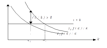 Как следует из рисунка 86, за повышением нормы сбережения следует скачок в темпе роста капиталовооруженности, затем по мере увеличения капиталовооруженности расстояние между кривыми sf(k)/k и (n+d) сокращается и устремляется к нулю. Таким образом, сразу вслед за повышением нормы сбережения темп роста капитала становится выше темпа роста населения, а по мере приближения к новому устойчивому состоянию темпы роста K и L вновь сближаются.