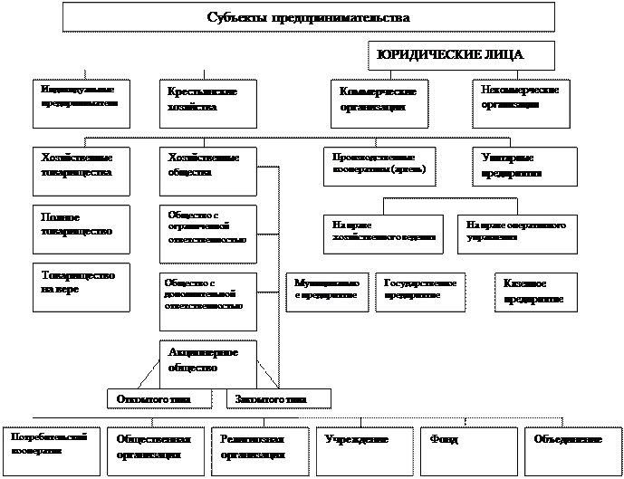 В Российской Федерации структура хозяйственно-правовых форм определена введенным в действие с 1 января 1995г. Гражданским Кодексом РФ, который подразделяет всех участников предпринимательской деятельности по юридическому статусу на физических и юридических лиц, а по цели деятельности — на коммерческие и некоммерческие организации.