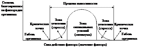 В соответствии с законами лимитирующих факторов и оптимума для каждого фактора по отношению к конкретному виду организмов можно вычертить диаграмму степени благоприятности данного фактора на организмы в зависимости от силы действия этого фактора, которую называют кривой толерантности (выносливости) (рис.1.22). Почти всегда эта диаграмма имеет вид перевернутого колокола. На ней можно отметить критические точки, определяющие пределы выносливости (толерантности, от латинского слова толеранция - терпение) данного вида организмов по отношению к рассматриваемому фактору (поэтому данная диаграмма и называется кривой толерантности). Выход за эти пределы ведет к массовой гибели организмов. Зона вблизи максимума кривой называется зоной оптимальных условий (оптимума). В этих пределах обычно наблюдается максимальная плотность популяции. За пределами этой зоны между критическими точками находятся зоны угнетения (стресса), в которых организмы находятся в состоянии стресса.
