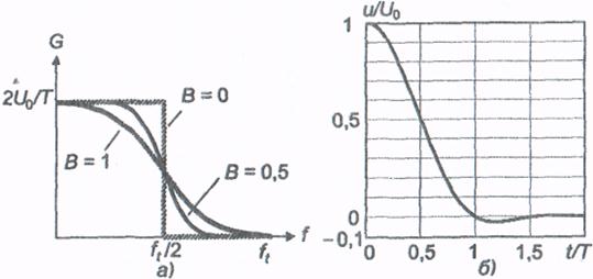 вид которого показан на рисунке 5.7. Этому сигналу соответствует спектр равномерной плотности 2 U 0 T в полосе частот от 0 до 1/2 T (линия B =0 на рисунке 5.8,а). Такой сигнал практически получить невозможно, однако даже в случае его реализации на приеме потребовалось бы очень точное совпадение моментов принятия решения с тактовыми точками. При самом незначительном их расхождении в данном случае имеют место такие сильные межсимвольные искажения, что восстановление информации становится невозможным. Однако достаточно точно может быть реализован сигнал, форма спектра которого соответствует прямоугольной, сглаженной по косинусоидальному закону (рисунке 5.8,а).