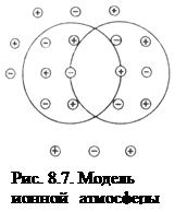 дит к тому, что катионы и анионы испытывают взаимное притяжение, а ионы одного знака заряда отталкиваются друг от друга. Благодаря притяжению каждый ион как бы окружен шарообразным роем противоположно заряженных ионов, получившим название «ионной атмосферы», в то время как ионы одноименного знака располагаются дальше (рис. 8.7). При этом ионы сольватируются (гидратируются), что также отражается на их свойствах и свойствах растворителя.