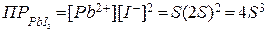 Концентрация растворившейся соли PbI2 в насыщенном растворе составляет s; за счет диссоциации данного сильного электролита в соответствии со стехиометрическими соотношениями в растворе содержится s моль/л ионов Pb2+ и 2s моль/л ионов I‾, т.е. [Pb2+]=s; [I‾]=2s.