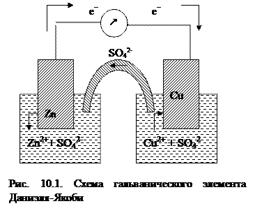 Рассмотрим один из наиболее простых ГЭ – медно – цинковый, или элемент Даниэля – Якоби (рис. 10.1). В нём проводником соединяются пластинки из цинка и меди, при этом каждый из металлов опущен в раствор соответствующей соли: сульфата цинка и сульфата меди (II). Полуэлементы соединены электролитическим ключом1, если находятся в разных сосудах или разделены пористой перегородкой, если находятся в одном сосуде.