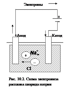 Электролиз расплавов. Рассмотрим электролиз расплава хлорида натрия (рис. 10.2). Это простейший случай электролиза, когда электролит состоит из одного вида катионов (Na+) и одного вида анионов(Cl
