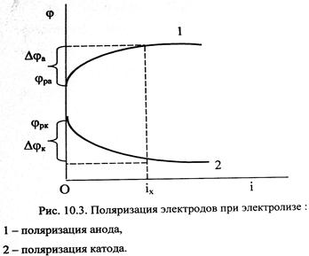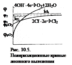 Эта аномалия связана с анодной поляризацией процессов (рис. 10.5). Как видно, равновесный потенциал кислородного электрода (потенциал окисления гидроксид-ионов из воды) меньше равновесного потенциала хлорного электрода (потенциала окисления хлорид-ионов). Поэтому при малых плотностях тока выделяется лишь кислород. Однако выделение кислорода протекает с более высокой поляризацией, чем выделение хлора, поэтому при потенциале