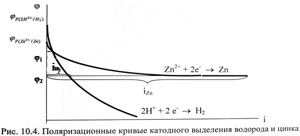 Например, из рис. 10.4 следует, что выход по току цинка растет с увеличением катодной поляризации. Для данного примера высокое водородное перенапряжение – явление положительное. Вследствие этого из водных растворов удается выделять на катоде марганец, цинк, хром, железо, кобальт, никель и другие металлы.